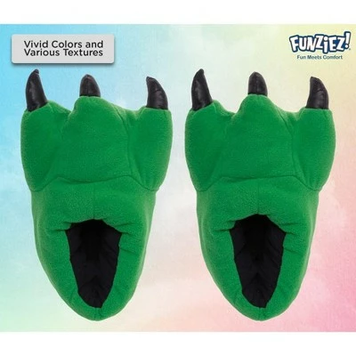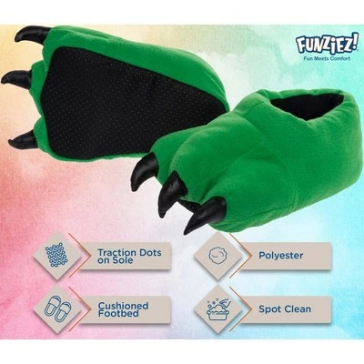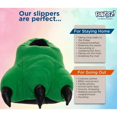 Walk in a dinosaurs footsteps with these plush dinosaur paw slippers with cushioned support by FUNZIEZ! Each slipper features a stuffed plush dinosaur paw with three stuffed toes and claws. These roar-tastic fuzzy dino feet house shoes are ultra soft and comfortable enough to lounge around in the house for hours. Perfect for dinosaur lovers and for any fans of prehistoric creatures! Spread some happiness and joy every time you or someone else looks down at the adorable little dinosaur surrounding your toes.