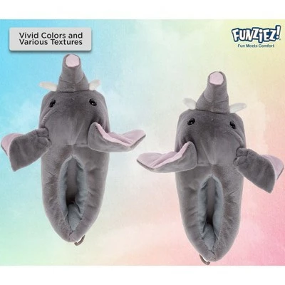 Ele-phantastic slippers that are ultra soft and comfortable enough to lounge around in the house for hours. Get cozy with these plush elephant slippers with cushioned support by FUNZIEZ! These adorable fuzzy elephant house shoes feature a elephant, with a trunk, tusks, big ears, embroidered eyes, and a tail at the back of the slipper. These are perfect for elephant lovers and any fans of safari animals! Spread some happiness and joy every time you or someone else looks down at the adorable little guy surrounding your toes.