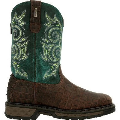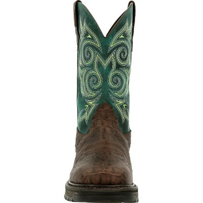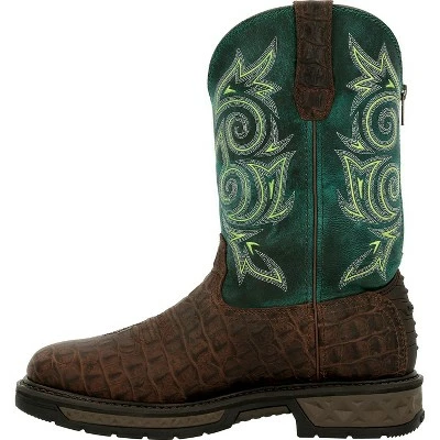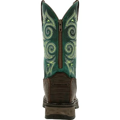 Built with a Goodyear® welt construction, this Carbo-Tec LT waterproof pull-on western work boot is equipped with lightweight comfort and one tough outsole.The full-grain leather upper features a green shaft with a western fancy stitch pattern and a toe bug. Leather pull straps and a rear zipper allow you to easily pull on this work boot. The dual functioning Counter Lock System prevents heel slippage and protects the back of the boot when kicking it off.Our Georgia Waterproof System and a high-performance mesh material line the interior of this boot. Additionally inside is the Quick Response insole; a removable, shock absorbing polyurethane foam footbed.Below the insole is a fiberglass shank for added stability and a thick EVA midsole that cushions with each step. The outsole on this pull-on work boot is designed to withstand incredibly rugged job conditions. It’s made from our Carbo-Tec Rubber, our proprietary blend that gives it high resisting properties against heat, chemicals, slips, abrasions and oil. It has been tested to meet ASTM F2892 electrical hazard classification for soft toe work boots.
