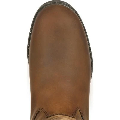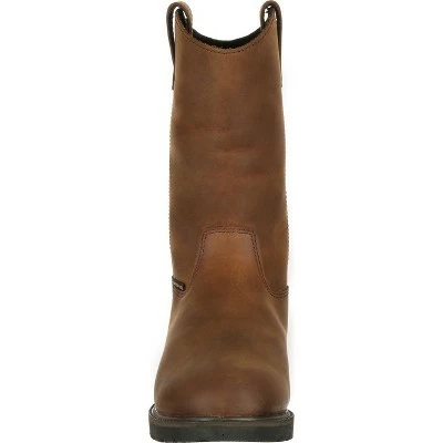 A great work boot for the farm or ranch, the Georgia Boot® Suspension System Waterproof Wellington Work Boot is comfortable and keeps your feet dry.This pull-on boot is a guaranteed waterproof boot. Water, mud and muck stay on the outside when you wear this boot.Made of full-grain leather, the men’s boot also looks good. It has just hint of a western shape, helping it fit right on a ranch or farm.And whether you work in agriculture or an entirely different industry, comfort is important. This definitely is a comfortable boot due to the CC5 Comfort Core® insole. This polyurethane insole was created for stability and comfort. It has an ergonomic arch for hours on your feet, and perforations on the underside make sure that air flows to your feet.Other interior features include a steel shank for even more arch support and a mesh lining.This footwear has a polyurethane Suspension Outsole that’s oil resistant and slip resistant. The outsole has suspended center lugs that help reduce the impact of work site conditions and dissipate energy into the midsole. This flexible outsole has Pivot Pods that resist abrasions for a longer-lasting outsole.The 11-inch construction boot has pull straps at the top so it goes on easy.If you need a waterproof work boot, why not make it a comfortable work boot, too? You deserve it, and you get both with this Suspension System boot.
